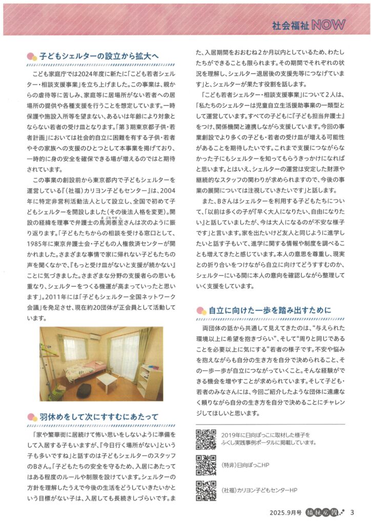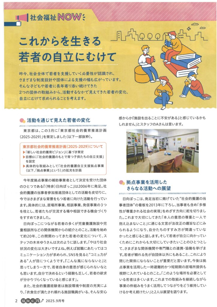 東京都社会福祉協議会から8月に取材を受けた記事が掲載されました。日向ぼっこサロンの写真も付けていただき、多くの方に記事を読んでいただき、サロンの様子を知っていただける機会になればいいなと思います。